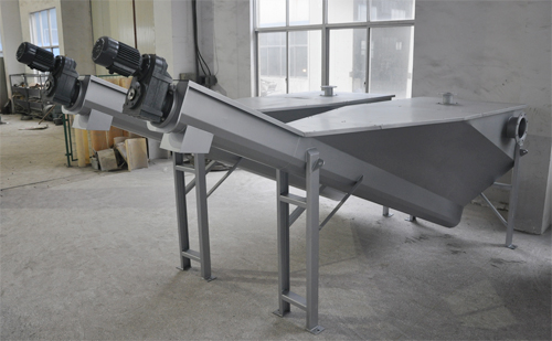 砂水分離器設備一般螺旋傾角為25~30°之間,砂水混合液從進水管進入本設備,混合液通過分離機上部的聚集箱,在水流的作用下,使混合液的砂粒與有機物進行分離,砂水進入集砂槽中,比重較大的顆粒(如砂粒)由于自重而下降,沉積于螺旋槽底部,在螺旋葉片的推動下,物料沿斜置的U型槽底部提升,離開液面后,繼續上移一段距離,砂粒中的水分逐漸在螺旋槽葉片的空隙中流回水箱,砂粒液逐漸干化到出料口處,依靠自重落入其他輸送裝置中,上清液則不斷從排水堰溢流出去,有機物在水流漩渦的作用下,也跟著上清液從溢流槽流出,回流至污水井中,從而達到砂水分離的作用。