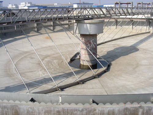 原水從池底經中心支墩上不流出,并經穩流筒配水后,呈輻射狀流向池子周邊集水槽出水,隨著輻向流速的降低,原水中的懸浮物被分離而沉降于池底。工作橋以中心支座為圓心,帶動刮泥、排渣機構,在驅動裝置驅動下將污泥刮集至沉淀池中心集泥槽,依靠水壓或泵排出池外,上部浮渣由刮渣板同步刮至排渣斗排出。